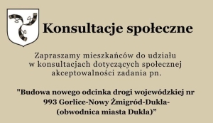 Konsultacje społeczne dotyczące budowy nowego odcinka drogi wojewódzkiej nr 993 Gorlice – Nowy Żmigród – Dukla (obwodnica miasta Dukla) dla mieszkańców miejscowości: Dukla, Lipowica, Nadole, Teodorówka i Zboiska.